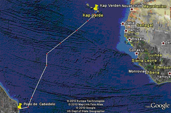 hinter uns lassen. Auf nach Suedamerika, Brasilien ist unser Ziel. Unter vollen Segeln bis der Wind uns